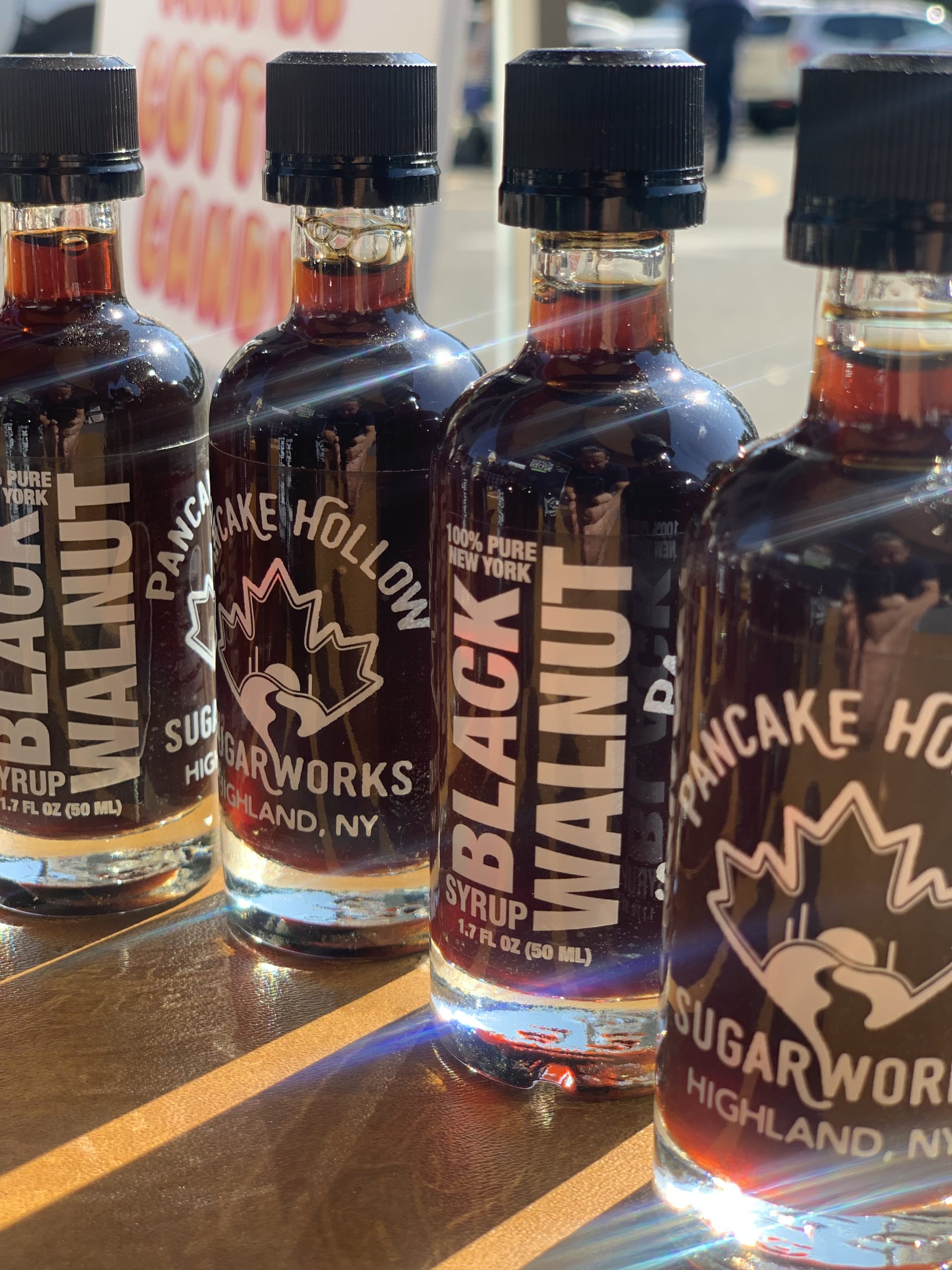 We tap black walnut trees on several properties in Ulster County, New York during the sugaring season, some in Gardiner, NY and others in West Park, NY.  We boil down the season’s sap into a single batch, selling some in bulk as soon as harvest is compete – to a distillery for a Black Walnut Bourbon Liquor, while saving some for sale exclusively here on our website.  Black Walnut Syrup, as we describe in a our blog, is a much more rare syrup than Maple; we make much less in volume, sell it for a higher price and sell it in smaller quantities so more people can experience it.  This product has a quite unique flavor, sweet like maple, but has its own flavor profile unlike any other, so if you seek exploring new culinary corners of your taste palate, we invite you to give this product a try and buy a bottle today!